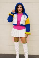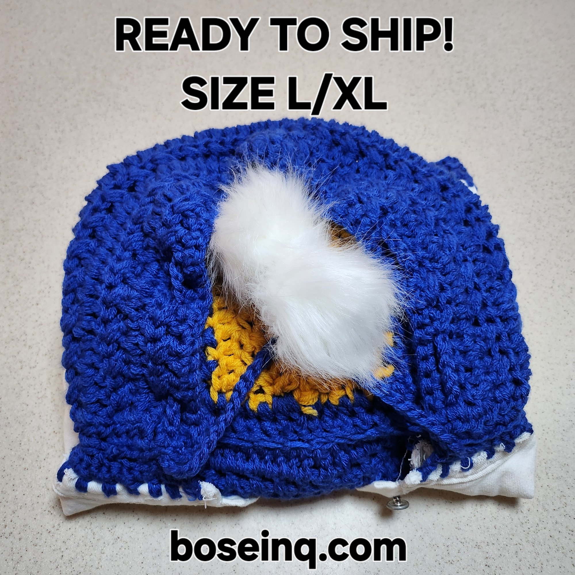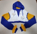 White denim cropped jacket, double strand crochet blue and gold yarn. One of a kind design.